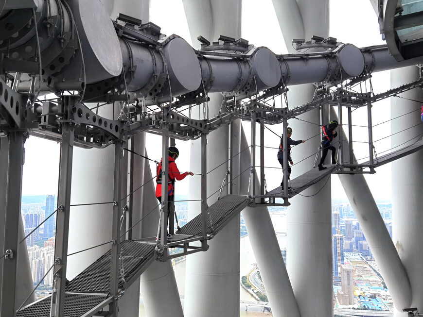 当记者来到天眼步道中的巅峰级挑战项目——天眼,就有点迟疑了:体验者将通过特殊装置,站在这个旋转器上,按动开关,装置旋转180度,体验者便置身于塔身之外,好悬!记者最后还是上了机器,感觉仿佛悬浮于高空之中,翱翔云端,毫无遮拦的全景视角,既恐惧又兴奋。
