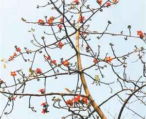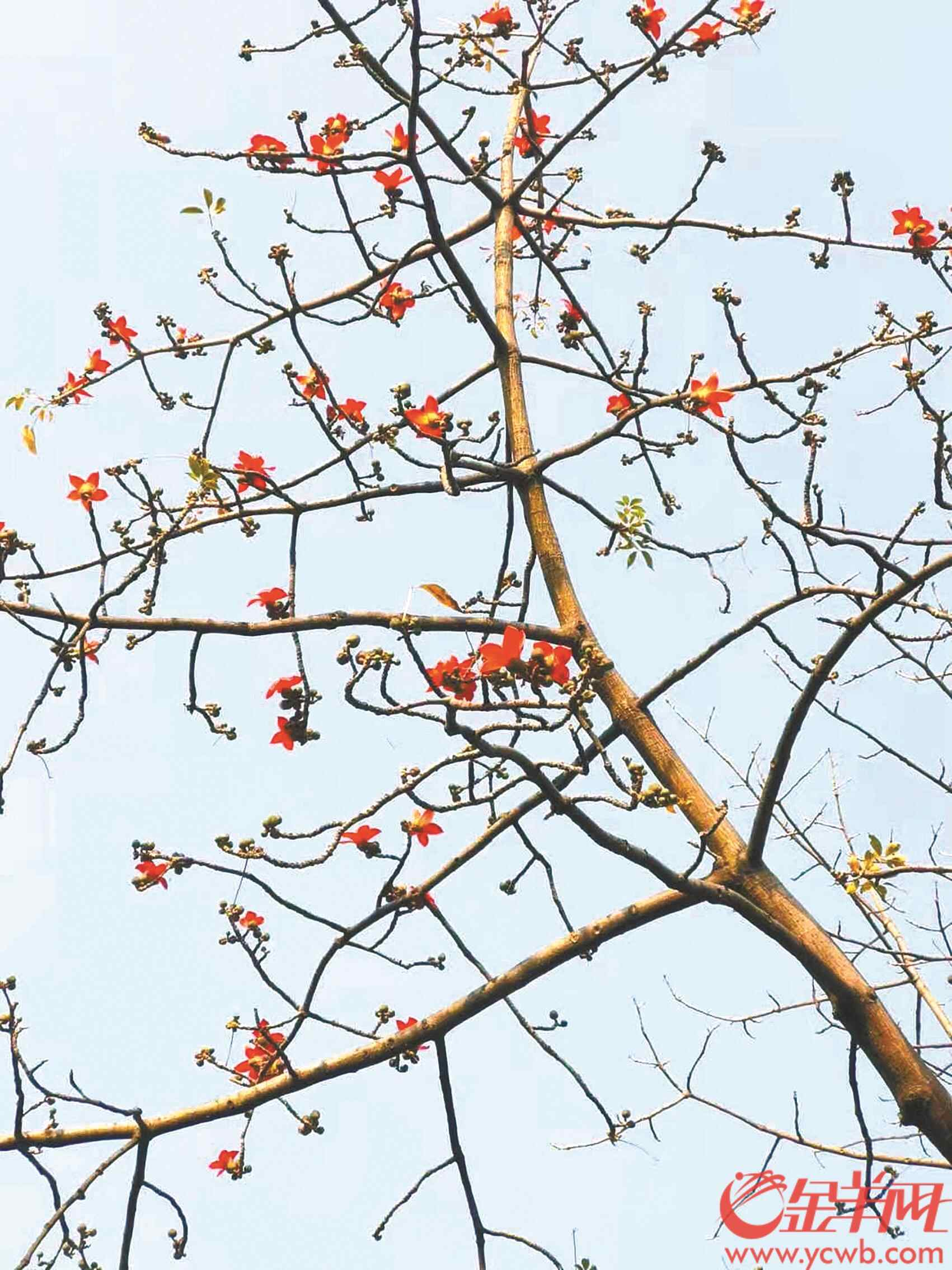 羊城晚报讯 记者汪曼摄影报道:27日,有市民报料称,在珠江公园的抱珠楼处有一株红棉数已经盛放十天左右。但广州木棉花的花期一般在二月下旬到四月中旬,三月为盛开期。如此提早开放相当少见。