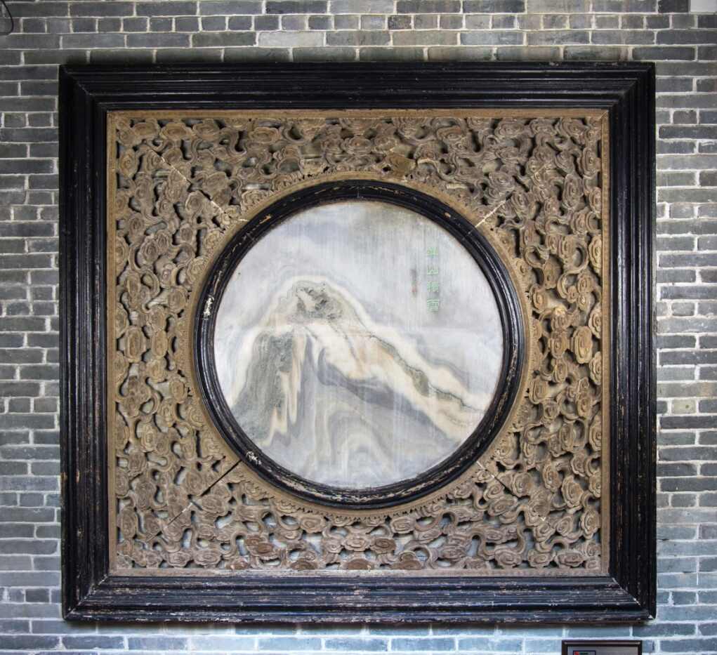清楠木雕通花镶理石“平山积雪”挂屏全貌,陈列于荔湾博物馆西关民俗馆内。(来源:广州市荔湾区博物馆)