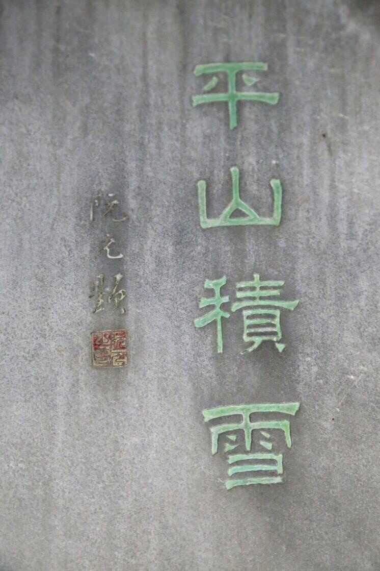 圆石右上方刻有清代两广总督阮元隶书题字“平山积雪”四字,字呈青色,与山石景致衬托呼应,点出了景色变化之妙。阮元(1764-1849)字伯元、文达,号云台、芸台、雷塘庵主,晚号怡性老人,扬州仪征人,清嘉庆、道光年间名臣。于嘉庆二十二年(1817年)莅任两广总督,任期将近十年,其中四度兼任广东巡抚、兼署学政和粤海关监督,德政不少。阮元不仅是能臣,更是乾嘉训诂之学的泰斗级人物、著名的修志专家。其学问渊博,在经学、方志、金石学及诗词方面都有很高造诣,著述颇丰。有《揅经室集》《十三经注疏校勘记》《两浙金石志》等。阮元书法宽博大气,沉厚古朴,独具淳雅之意。此方理石落款署名“阮元题”,下钤白文方印,使该挂屏更添珍贵的人文色彩。