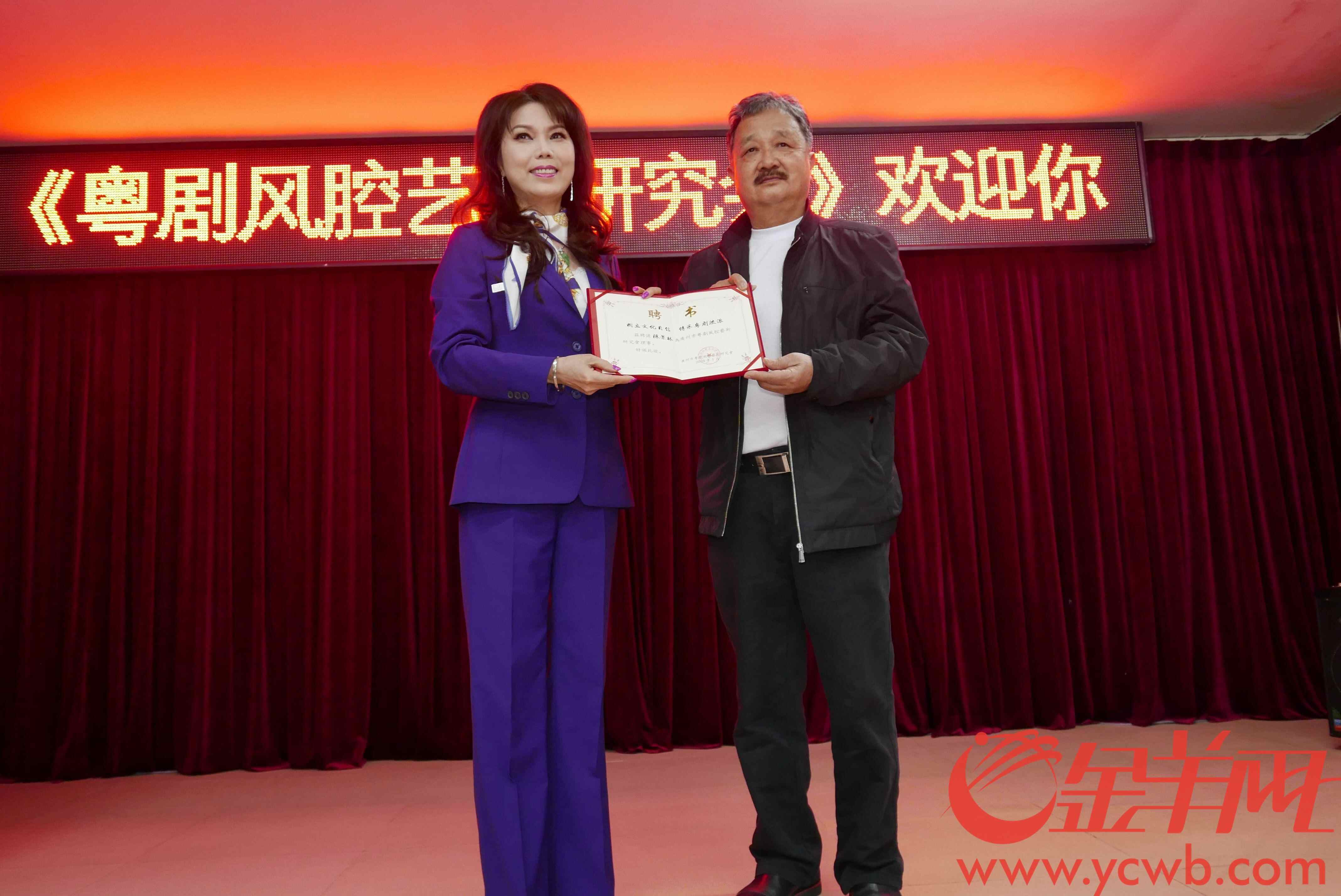 风腔研究会会长陈玲玉(左)向研究会理事颁发聘书