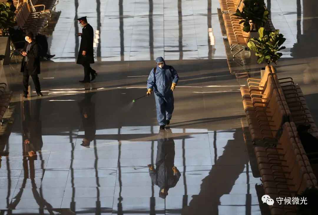 2021年1月29日,北京朝阳站,当天是全国春运第二天,专职消杀员徐桂金在车站二层候车大厅进行例行防疫消杀。中国青年报 陈剑/摄