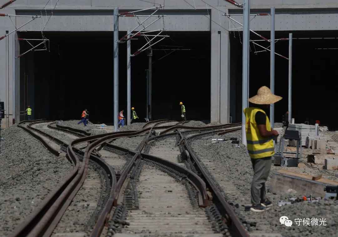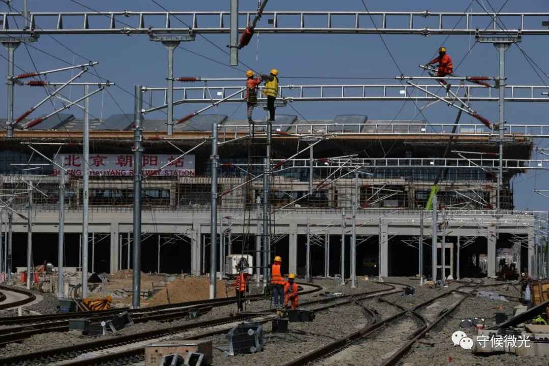 2020年9月22日,北京朝阳站建设工地附近,工人正在架设接触网。中国青年报 陈剑/摄