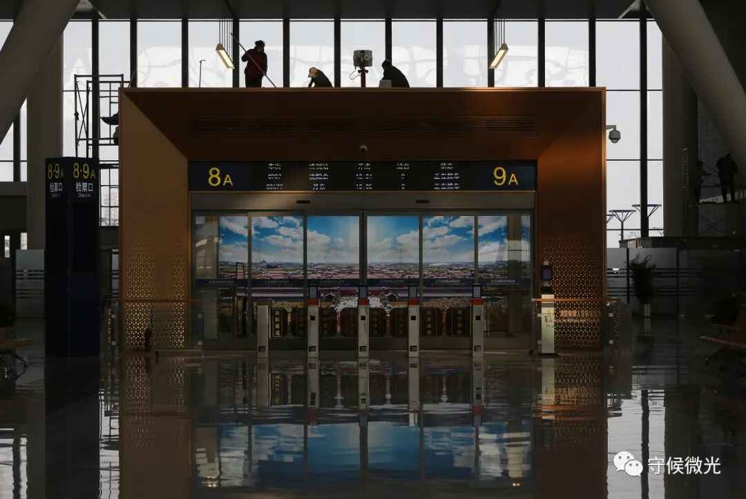 2021年1月20日,北京朝阳站,保洁工人正在做清洁,下方的进站通道内装饰着紫禁城全景照片。中国青年报 陈剑/摄