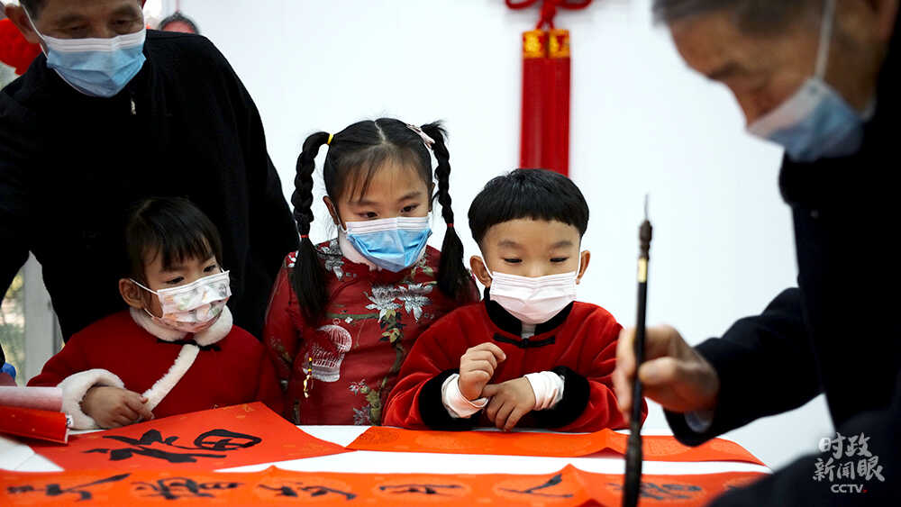 △金元社区居民活动室内,孩子们观摩书法写作。(总台央视记者王哈男拍摄)