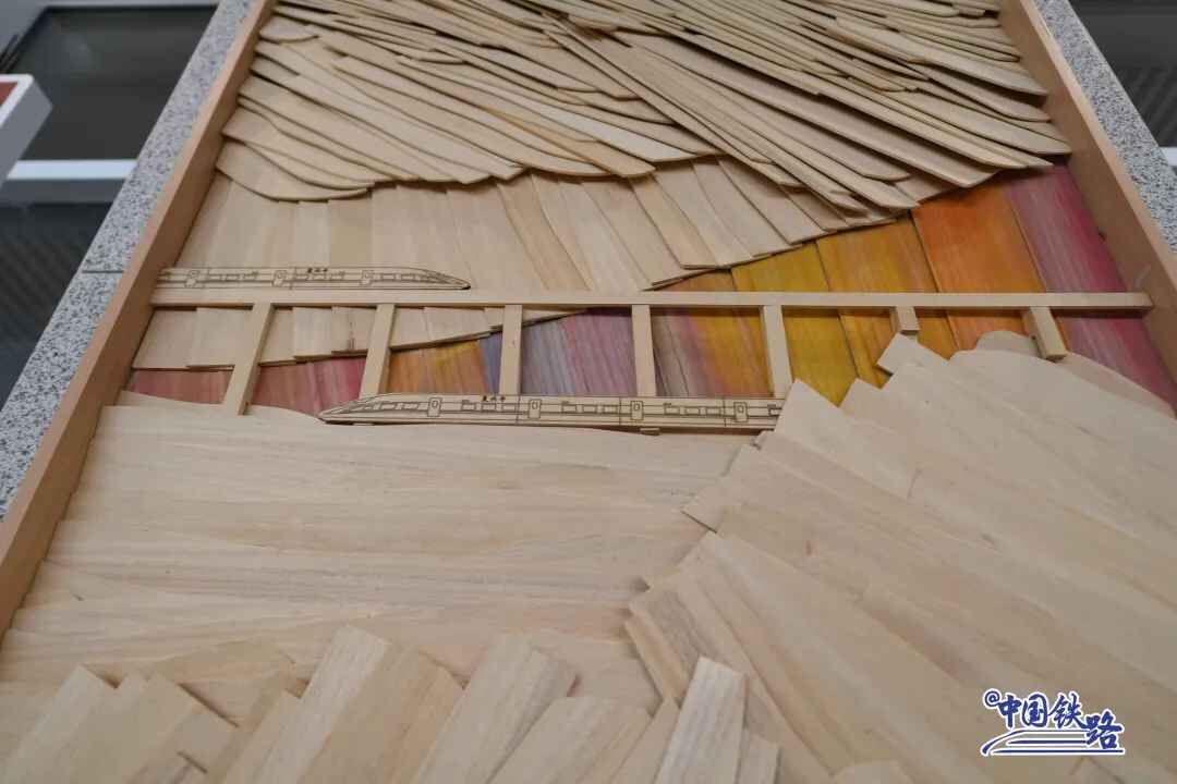 圆形立柱上分布有手工雕凿而成的装饰,通过阴影和色彩的不同,描绘出崇礼地区的山脉,也体现了太子城站的特色。