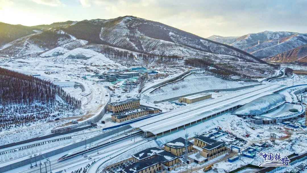 站房建筑以白色为主色调,鸟瞰之下犹如镶嵌在群山之间的明珠,彰显了冬奥冰雪文化。