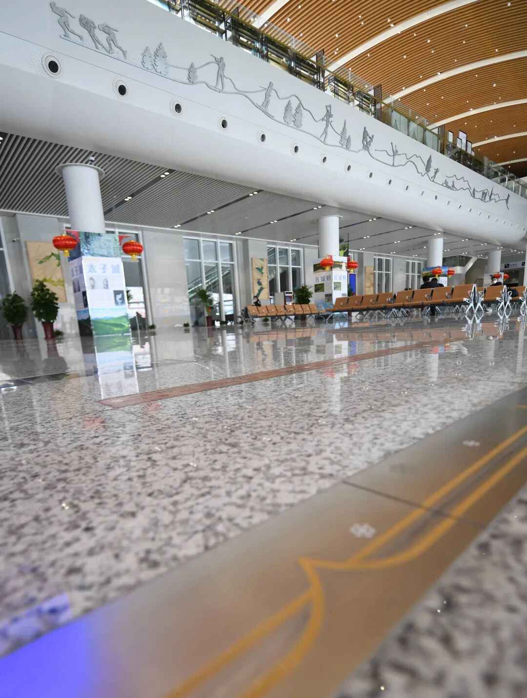 换乘中心采用了清水混凝土柱山水雕刻、马赛克艺术墙、仿木龙骨吊顶等艺术处理,让国内外运动员和旅客在候车休息时可以欣赏中国传统文化之美。