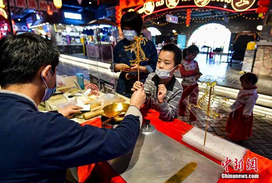 2月7日,新疆乌鲁木齐市城南往事怀旧美食街区,非遗传承人刘孝卿为小朋友制作牛造型的糖画。中新社记者 刘新 摄