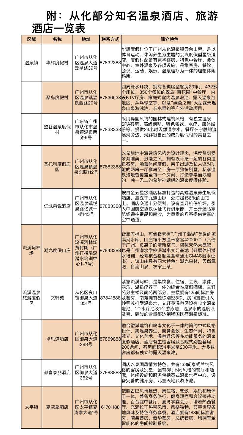 从化是一座山水之城,环境优美、空气优质,有世界仅有两处的珍稀小苏打温泉,近年来,从化加快发展新老温泉(温泉名胜风景区、流溪温泉旅游度假区)一体化建设,同时大力发展民宿业态,各类高端温泉酒店、精品民宿成为热门的旅游产品。