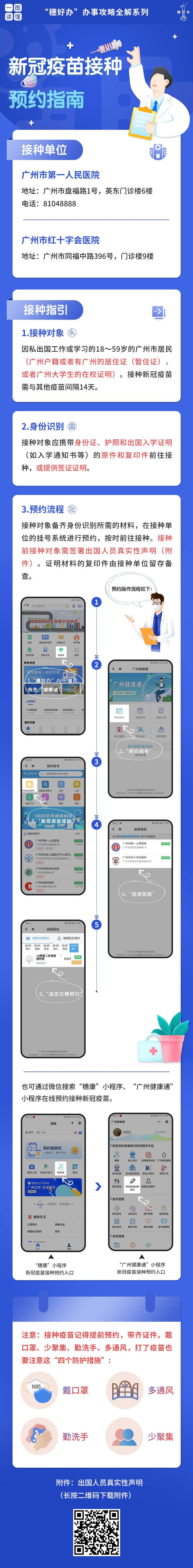 为方便在穗市民接种新冠疫苗,近日,“穗好办”APP、“穗康”小程序、“广州健康通”小程序上线了“新冠疫苗接种疫苗”服务。接种对象为因私出国工作或学习的18~59岁的广州市居民(广州户籍或者有广州的居住证(暂住证),或者广州大学生的在校证明)。