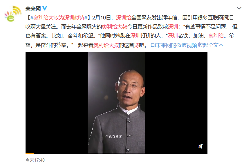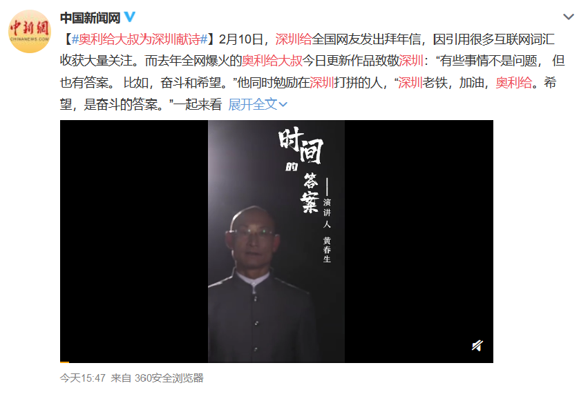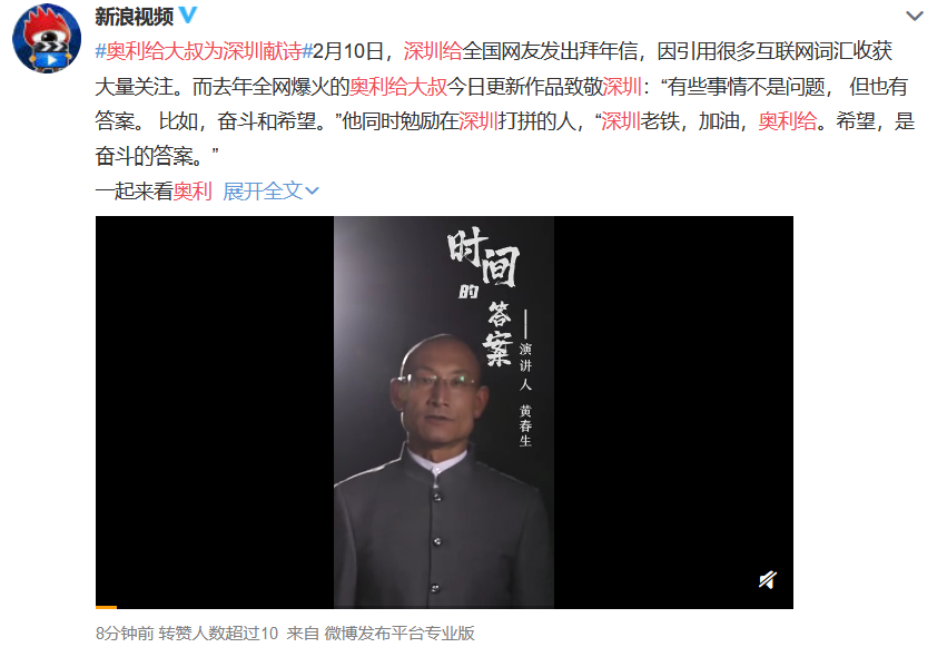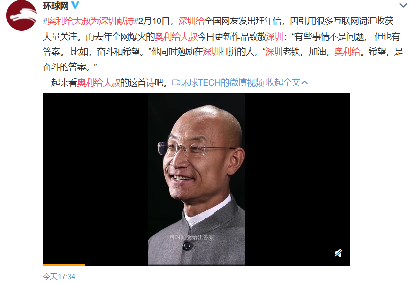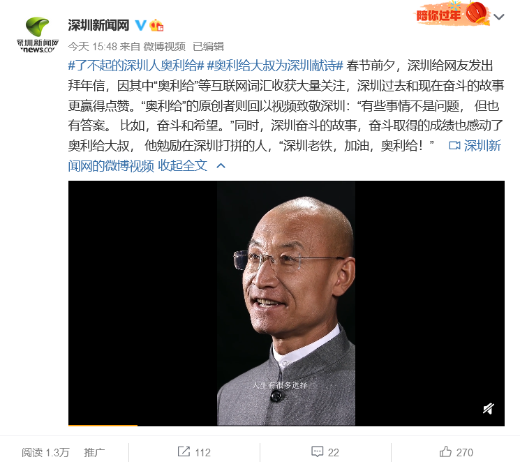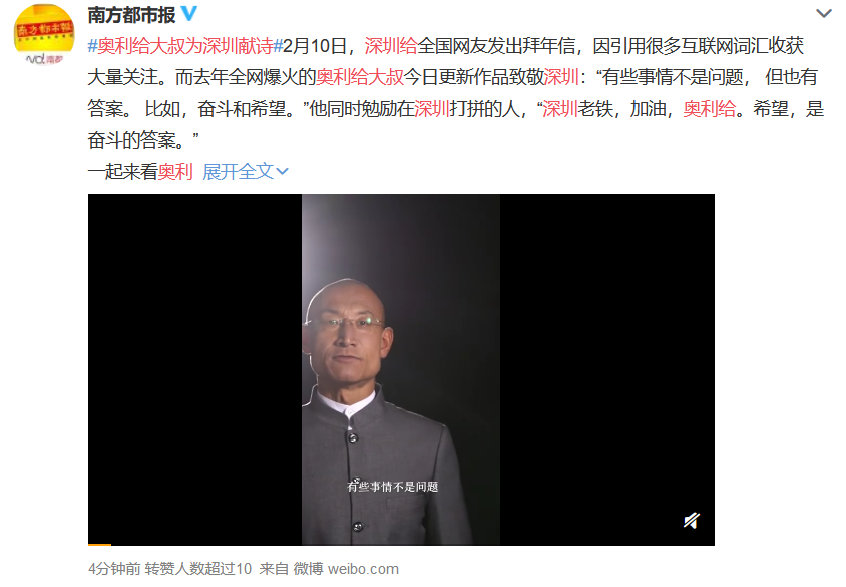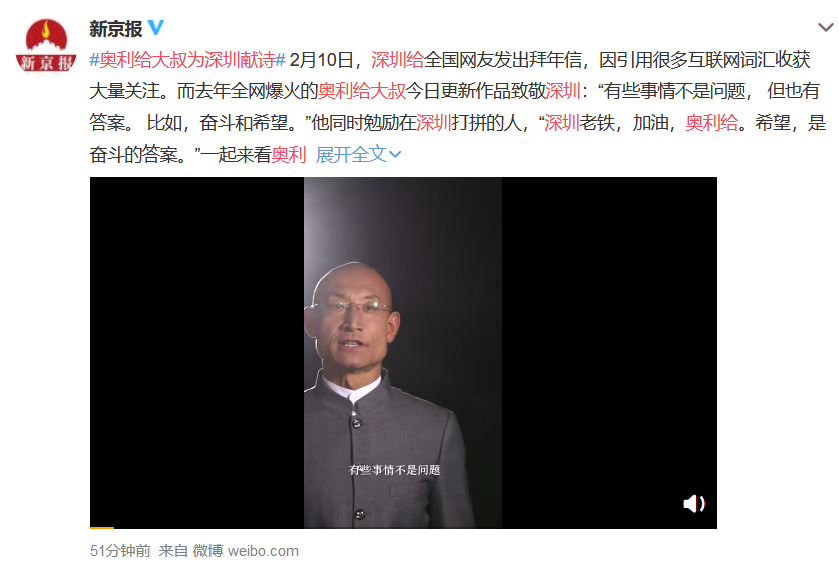 答案揭晓:今年牛年春节,深圳给网友的拜年信用到了大叔的关键词“奥利给”,给了大叔创作灵感!