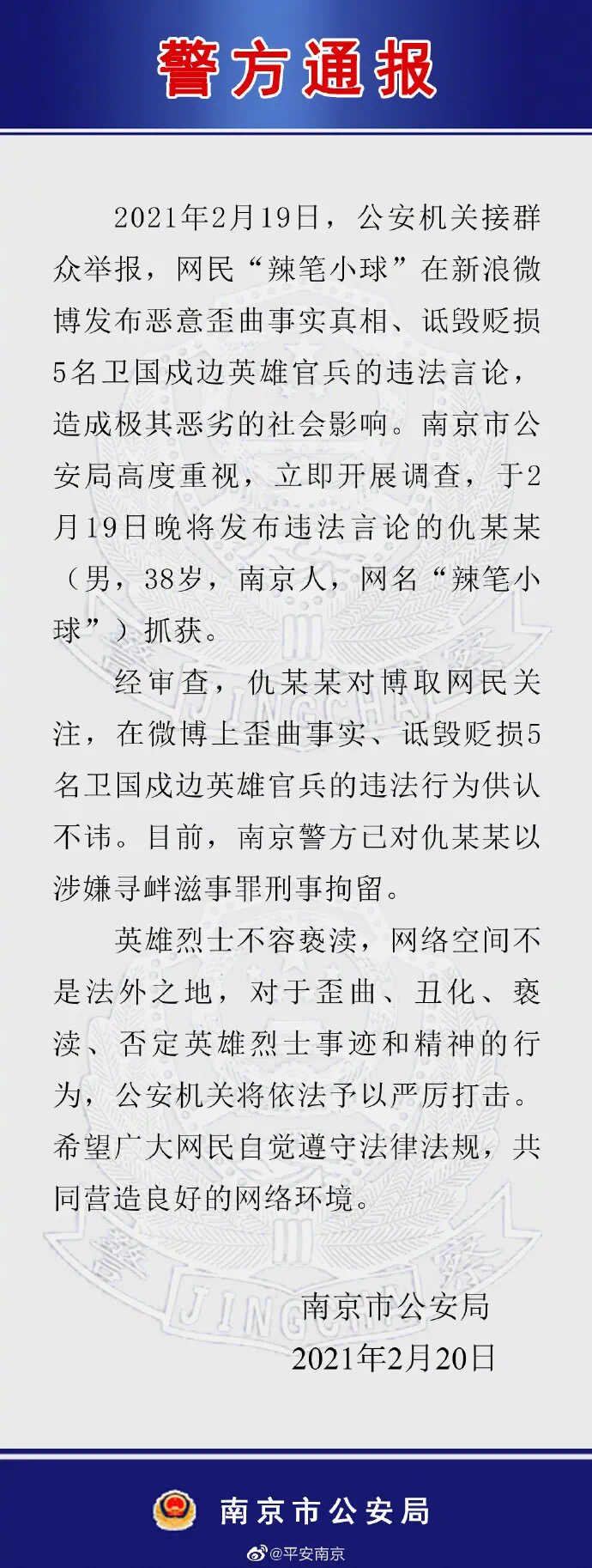 2月20日,江苏省南京市公安局官方微博发布通报称,2月19日,公安机关接群众举报,网民“辣笔小球在”新浪微博发布诋毁5名卫国戍边英雄官兵的违法言论,造成极其恶劣的社会影响。南京市公安局高度重视,立即开展调查,于2月19日晚将发布违法言论的仇某某(男,38岁,南京人,网名“辣笔小球”)抓获。