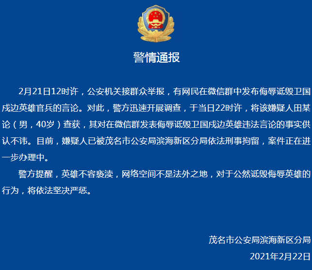 2月21日,茂名公安机关接群众举报,有网民在微信群中发布侮辱诋毁卫国戍边英雄官兵的言论。对此,警方迅速开展调查,于21日22时许,将该嫌疑人田某论(男,40岁)查获,其对在微信群发表侮辱诋毁卫国戍边英雄违法言论的事实供认不讳。