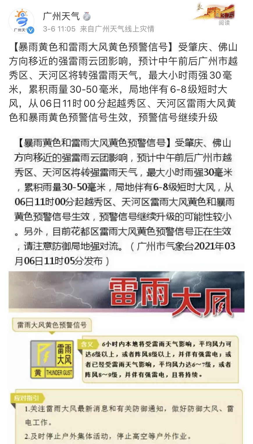 广州在3月6日发出今年首个暴雨和雷雨大风预警信号 广州市气象局官方微博截图