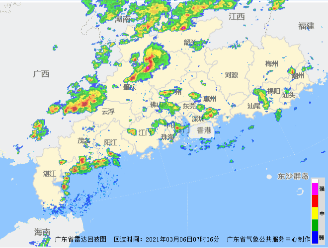 2021年3月6日早上,气象雷达记录到“雨水大军”在广东“行军” 广东省气象公共服务中心制作