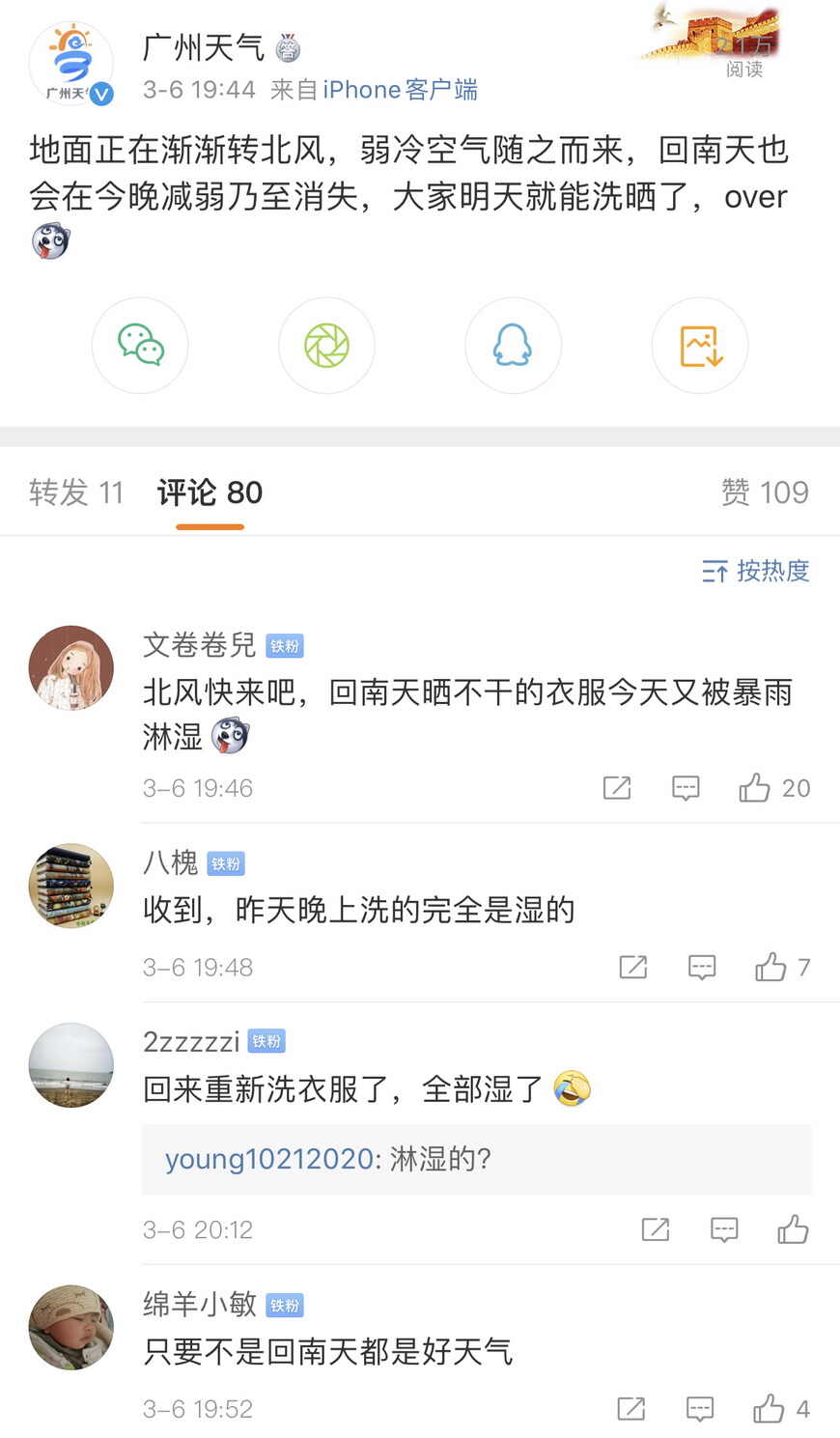 3月6日夜间,网友在广州市气象局官方微博中留言,求“回南天”快点走 广州市气象局官方微博截图