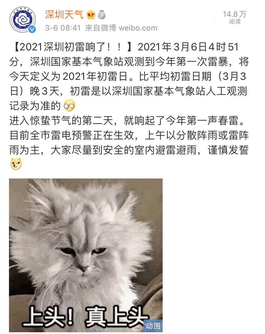 深圳“官宣”3月6日记录到2021年“初雷”深圳市气象局官方微博截图