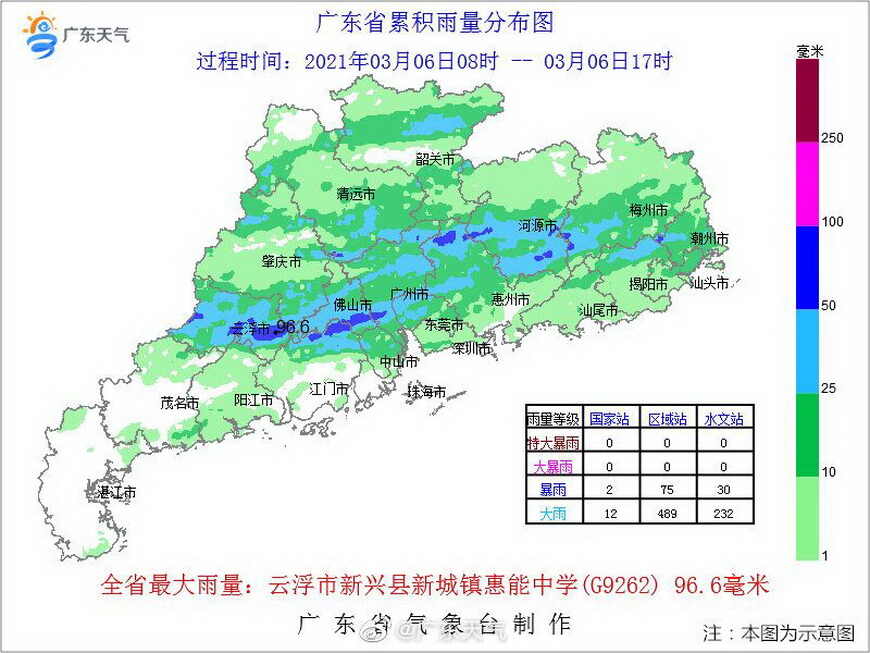 根据广东省气象水文部门统计,3月6日8时至3月6日17时,广东省有63个镇街录得超过50毫米的暴雨,有307个镇街录得25毫米至50毫米的大雨,其中云浮新兴县新城镇录得全省最大累计雨量96.6毫米。