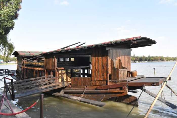 在南湖革命纪念馆附近的会景园码头,记者乘船前往湖心岛,树影婆娑中,一条红色的画舫隐约可见。据介绍,这条画舫全长约16米、宽3米,是一艘中型的单夹弄丝网船,船头宽平,内有前舱、中舱、房舱和后舱。中舱内摆着一张方桌、几把椅子,桌上还摆放了茶具,当年会议就是在中舱举行的;前舱则搭有凉棚,房舱设有床榻,后舱置有橱灶等物。画舫的后面还系着一条小拖梢船,为当时进城购物接人等所用。南湖革命纪念馆馆长张宪义在接受记者专访时表示:“嘉兴有那么多条红色的画舫,却只有这一条能被誉为‘南湖红船’,它不仅体现了中国共产党人的初心和使命,还孕育了中国革命精神之源——‘红船精神’。”