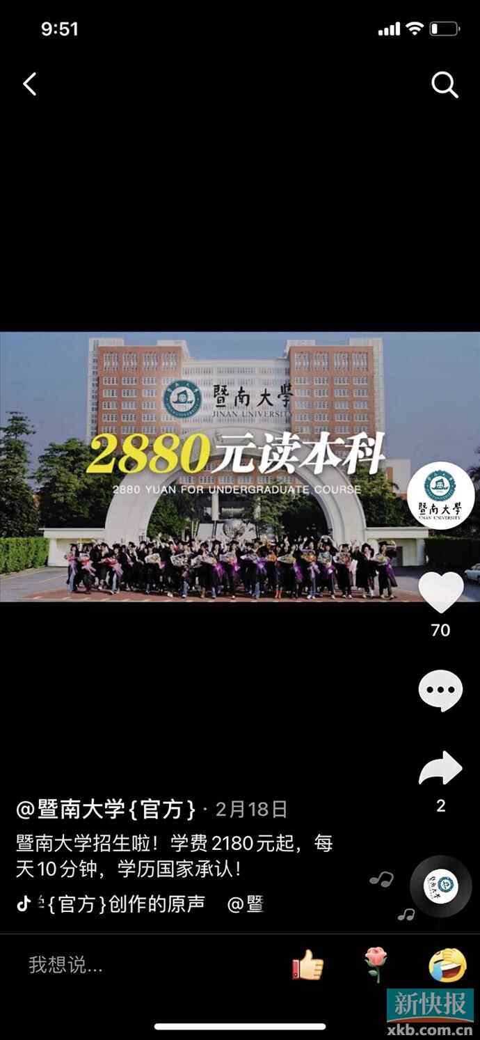 此外,新快报记者打开抖音搜索“暨南大学”“暨南大学教育学院”等关键字眼,就能搜出名称为“暨南大学”“暨南大学招生点”“暨南大学招生中心”“暨南大学{官方}”的广告视频,视频中宣称“学费3980元,1.5年学制”“院校直招、不限基础”“初高中学历上班族均可报名”…… 不仅以暨南大学的名义对外招生,还使用了暨南大学的图标、学校图片等相关资料。