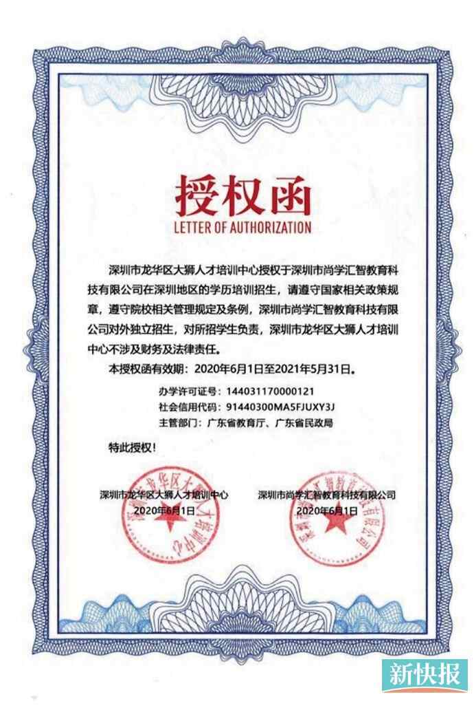 此外,该工作人员表示,尚学汇智有暨大的授权,可以进行招生。并向记者出示了一份授权函,其中提到“深圳市龙华区大狮人才培训中心授权于深圳市尚学汇智教育科技有限公司在深圳地区的学历培训招生”。当记者质疑其“并非暨大授权”时,该工作人员连忙解释道:“暨大给大狮人才培训中心授权,我们又接到大狮人才培训中心的授权,所以就相当于有暨大授权,我们也有资格去招生。”事后,记者在暨南大学教育学院官网查询得知,暨南大学的合作教学点中却没有这两家单位。