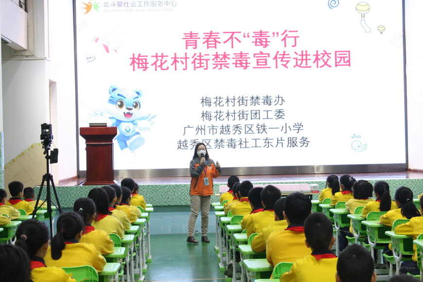 3月22日,为广泛宣传禁毒知识,增强青少年学生拒毒防毒意识,在广州市越秀区禁毒办指导下,梅花村街禁毒办、梅花村街团工委和广州市北斗星社会工作服务中心联合广州市越秀区铁一小学开展“青春不‘毒’行”禁毒宣传进校园活动。通过现场活动与网络视频相结合的模式,主办方组织约540名同学参与当天活动。