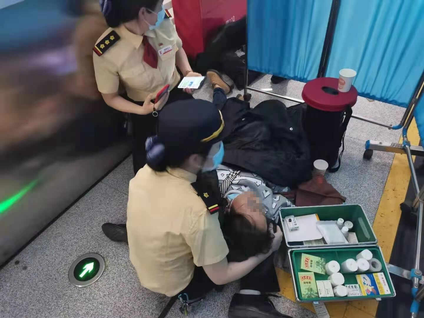 在征得其同意后,黄晓书马上通知行车值班员陈伟俊拨打120急救电话,并通过她提供的手机号与家人取得联系。随后,跟岗值班站长李碧容、站务员刘森林携带药箱搬来蓝色屏风。