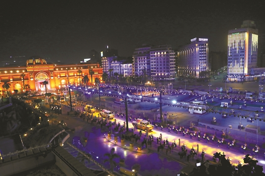 3日晚,埃及警方在首都开罗街头加强安保,封锁多条干道和交叉路口,以便一支搭载这批木乃伊的庞大车队从埃及国家博物馆驶抵7公里外的埃及文明博物馆。