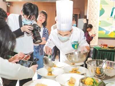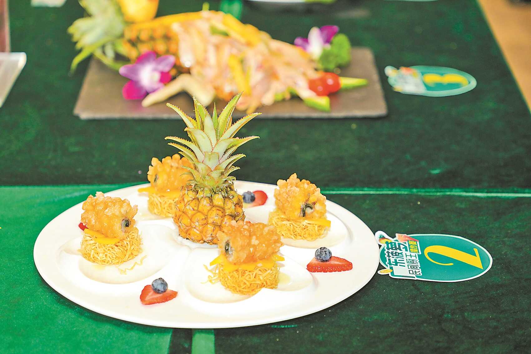 羊城晚报讯 记者许悦报道:菠萝手撕鸡、凤梨大鳝球、酥炸春卷花配菠萝汁、一菠三味……4月10日下午,由广东省农业农村厅主办的“广东菠萝民间厨王擂台赛”总决赛在广东省乡村振兴文化服务产业园举行,9位来自民间的烹饪高手大展厨技,展开了精彩比拼。这是2021广东菠萝“12221”品牌推广营销行动系列活动之一,将“粤菜师傅”文化与广东特色农产品相结合,进一步擦亮“粤字号”农产品的金色招牌。