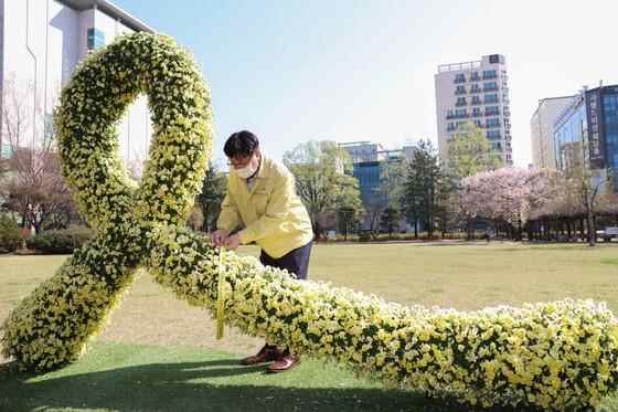 2021年4月16日,韩国迎来“世越号”沉船事故7周年纪念日。图为在仁川市教育厅中央草坪广场设置的象征追悼遇难者的黄丝带。(图片来源:韩国《中央日报》)