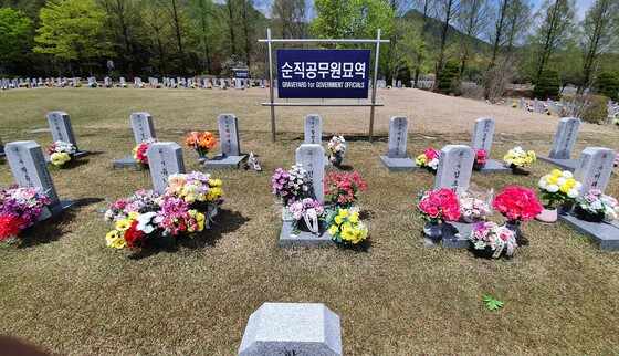 2021年4月16日,韩国“世越号”沉船事故迎来7周年纪念日。图为4月13日下午,国立大田显忠院遇难教师墓前摆放着追悼故人的花篮等。(图片来源:韩国《中央日报》)