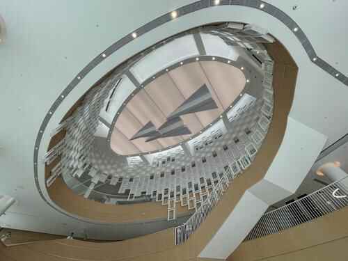 据介绍,该图书馆由“中国馆之父”何镜堂院士担纲设计,设计理念为“云山珠水,曲水流觞”,整体设计强调图书馆与城市空间整体和谐。新馆地下一层、地上两层,由环形步梯相连,总面积8218平方米,设计藏书量50万册,阅览坐席500个。按总价值测算,新图书馆价值超过10亿元人民币。