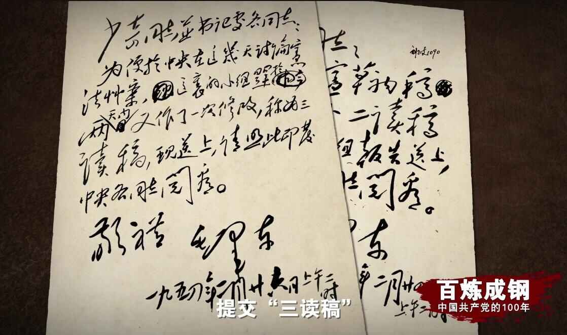 1954年2月24日,毛泽东致信在北京主持工作的刘少奇,提交“二读稿”。两天后,提交“三读稿”。落款处的时间,都是“上午二时”。