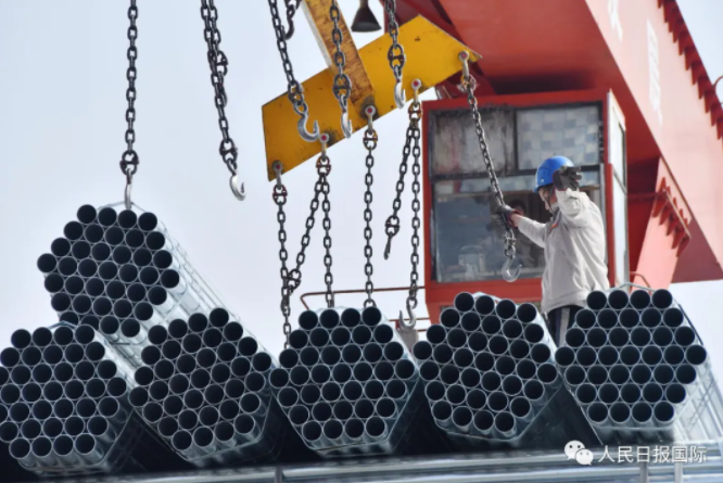 2021年4月13日,在河北省邯郸市永年工业园区的河北天创管业有限公司,工作人员正在吊运出口海外的镀锌钢管产品订单。胡高雷摄/人民视觉