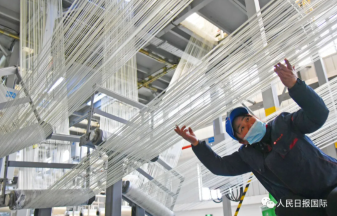 2021年4月16日,江苏连云港经济技术开发区,工人在查看碳纤维生产线运行情况。耿玉和摄/人民视觉