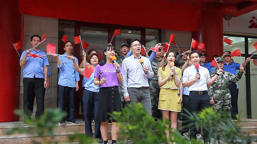 “时间只不过是考验,种在心中信念丝毫未减”……分散在中心正门小广场四周的50余名党员志愿者逐步向广场聚拢,戴红丝巾、手握党旗齐唱《少年》……