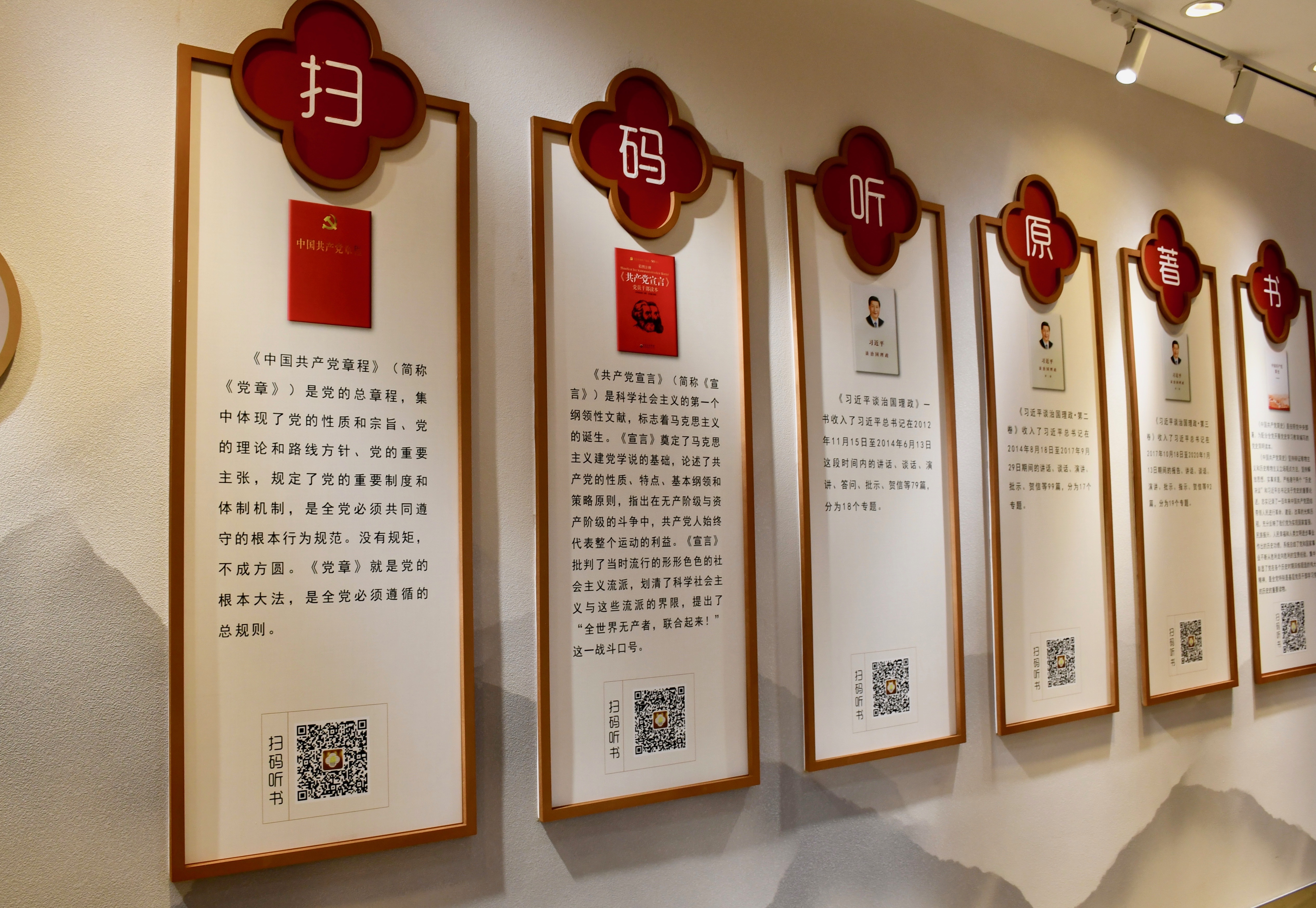 记者在现场看到,“海棠花开”党群服务中心二楼开辟“传唱经典 致敬英雄”、“扫码听原著”等两处党员学习教育主题墙。党员群众用手机扫一扫主题墙上的“二维码”,就可以阅读党史必读书目相关的原文、视频和音频,让社区党员随时随地、轻松学习党史。