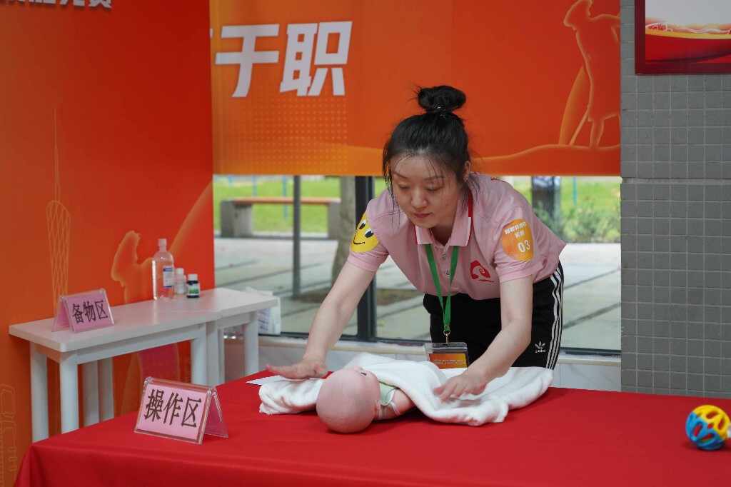 “我们是按照最新的国家职业技能标准进行命题,竞赛分为生活照料、保健与护理、教育实施与培训指导三大考题,今年的考核点新增了健康管理(包括心理行为观察、健康指导等内容),这是一大亮点,同时教育实施与培训指导是本次的难点。”育婴员项目裁判长何晓竹告诉记者。本次竞赛把健康管理融入到每一个项目中,比如在教育实施模块中把“早教”放在一个很重要的位置,竞赛中培训指导宝妈为13个月的宝宝做综合游戏,通过游戏随时关注宝宝的心理情绪和鼓励宝宝玩游戏,从而达到教育目的。