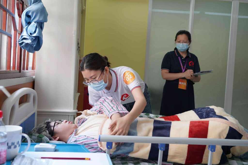 在医疗护理员赛区,他们要需要按照情景模拟,完成病人照护与关切、心理支持等。由志愿者扮演的SP(标准化病人),他们在比赛前经过了培训,每个场景要做什么动作和表情、说什么话都要一致,保证选手在比赛时面对的是统一标准的“病人”。例如,医疗护理员在喂水时,有的病人会呛咳、打湿床单,有的病人是骨折、偏瘫,通过这种方式考察选手如何去帮助病人。
