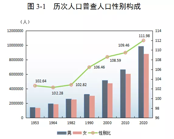 受经济发展水平、产业布局和产业结构等影响,全市常住人口中,男性人口为986.60万人,占52.83%;女性人口为881.06万人,占47.17%。总人口性别比(以女性为100,男性对女性的比例,下同)由2010年第六次全国人口普查的109.46上升为111.98,男女比例与全省(113.08)相比,较为均衡。