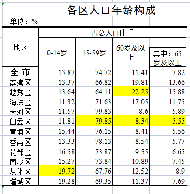从各区各自的人口结构占比来看,从化区0-14岁少儿占比高达19.72%,可以说是全市人口结构最“年轻”的区,而越秀区的60岁及以上的人占比高达22.25%,人口结构偏“成熟”。白云区15-59的劳动年龄人口占比将近80%,其65岁及以上老人占比仅仅为5.55%,可以说是劳动年龄人口最为充沛的区。