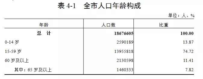 全市常住人口中,0-14岁人口为259.02万人,占13.87%;15-59岁人口为1395.58万人,占74.72%;60岁及以上人口为213.06万人,占11.41%,其中65岁及以上人口为146.03万人,占7.82%。与2010年第六次全国人口普查相比,0-14岁、15-59岁、60岁及以上人口的比重分别上升2.40个、下降4.07个、上升1.67个百分点。