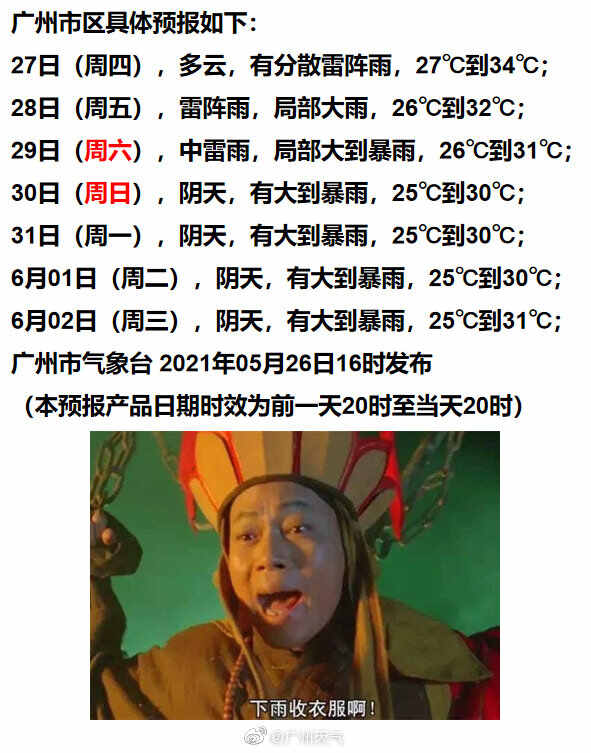 广州市气象台5月26日傍晚对未来一周广州地区的天气进行预测,“雨雨雨”将是主流天气 广州市气象局官方微博制图