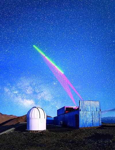 2019年,“墨子号”量子科学实验卫星团队在国际上首次利用量子卫星在地球引力场中对尝试融合量子力学与广义相对论的理论进行实验检验。图为“墨子号”量子卫星在西藏阿里地面站过境。绿光为卫星发出的信标光,红光为地面望远镜跟瞄光。中国科学技术大学供图/光明图片