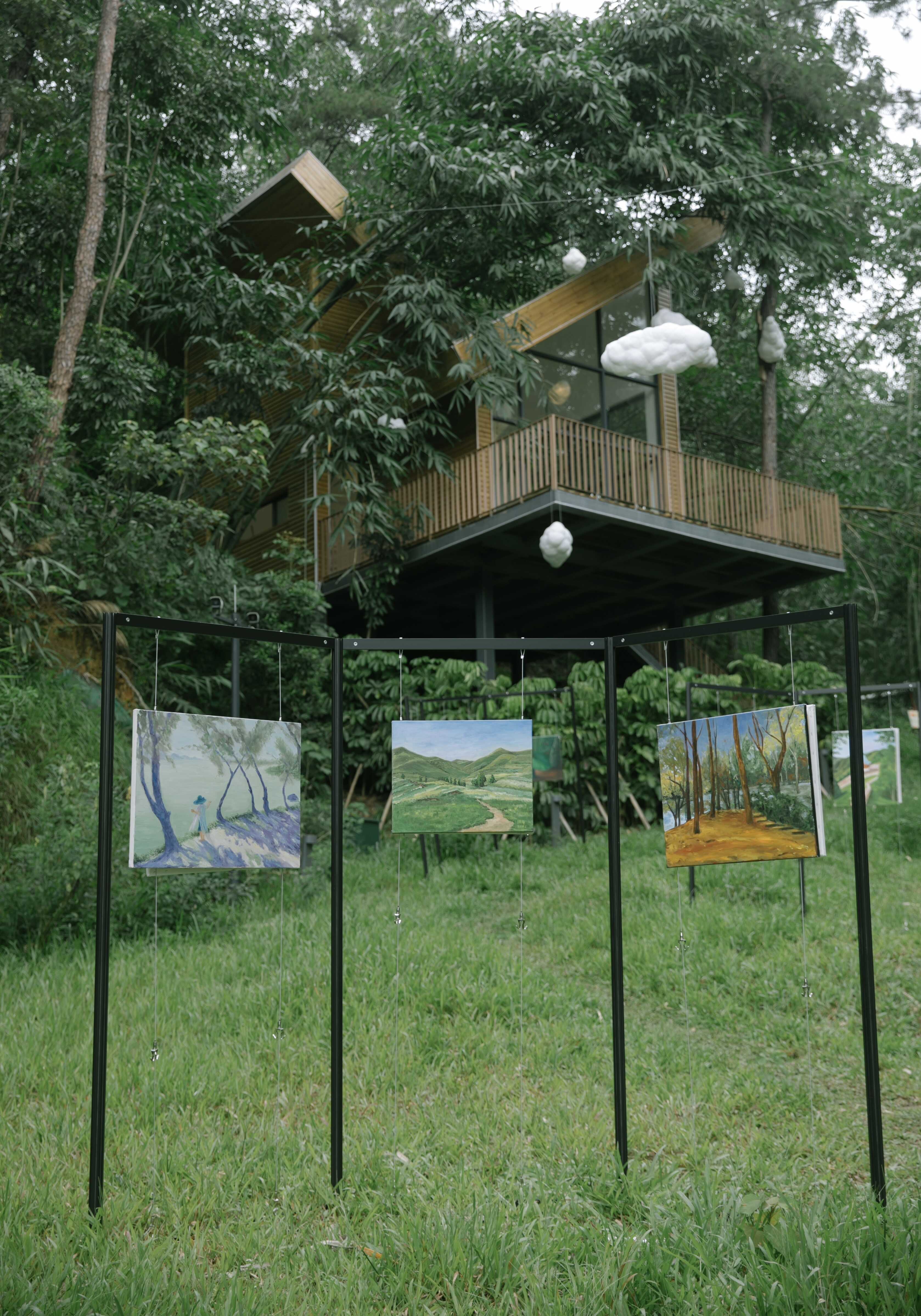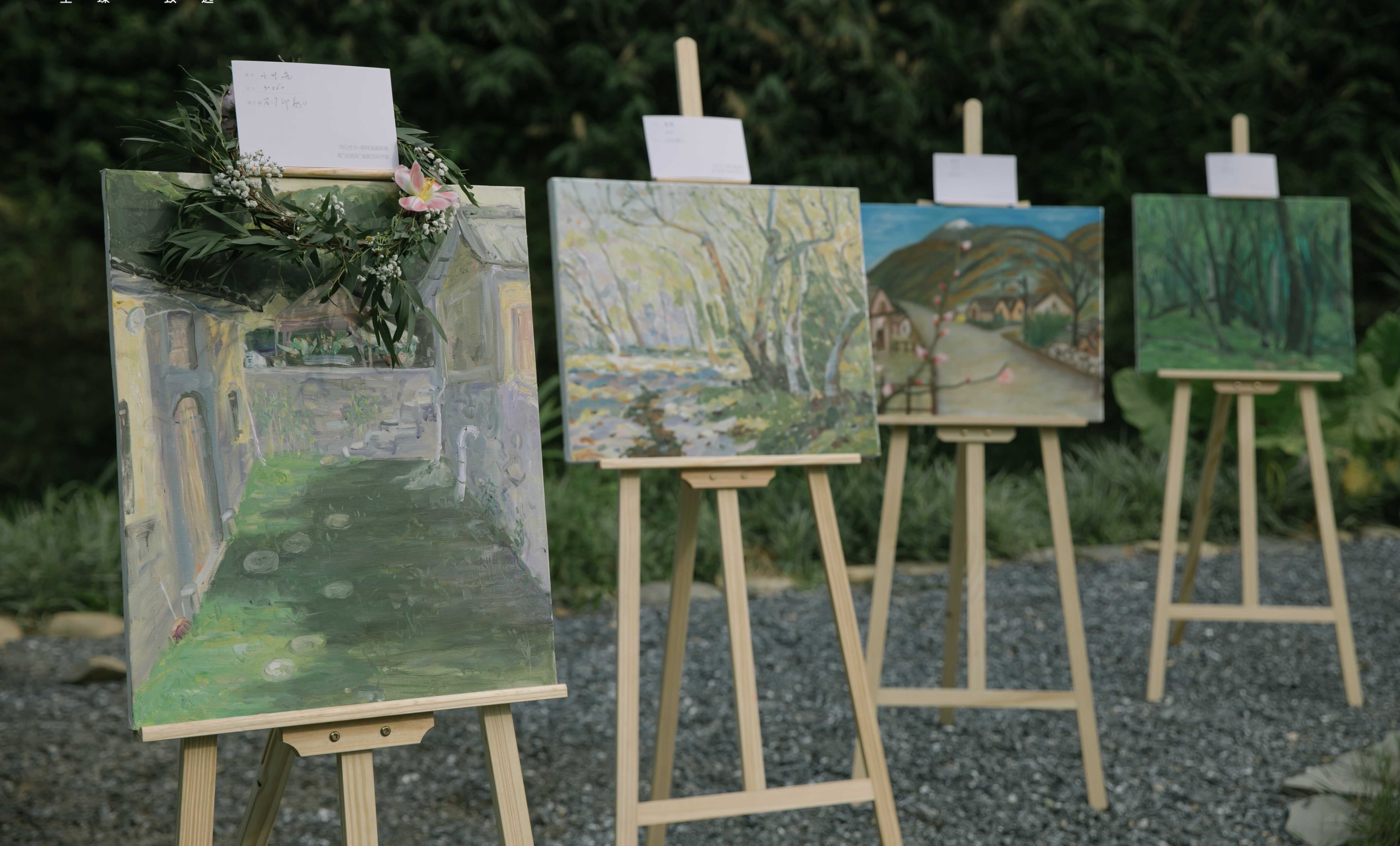 其中“白纸间”艺术展区创意地将山林坡地、木屋画室相结合,油画作品镶嵌在层层叠映的绿意中,现场宛若童话秘境。而溪谷顶端的“山谷剧场”,则是在更为开阔的高地平台中展示油画作品并开展了一场别开生面的艺术交流活动,其中,“《森林之歌》互动大画仪式”上,谷主与各位画家、媒体、溪客朋友们,在附有镂空的森林图案的空白油画布上涂上色彩,完美地诠释了本次画展的“开放”和“自由涂抹”的主旨。