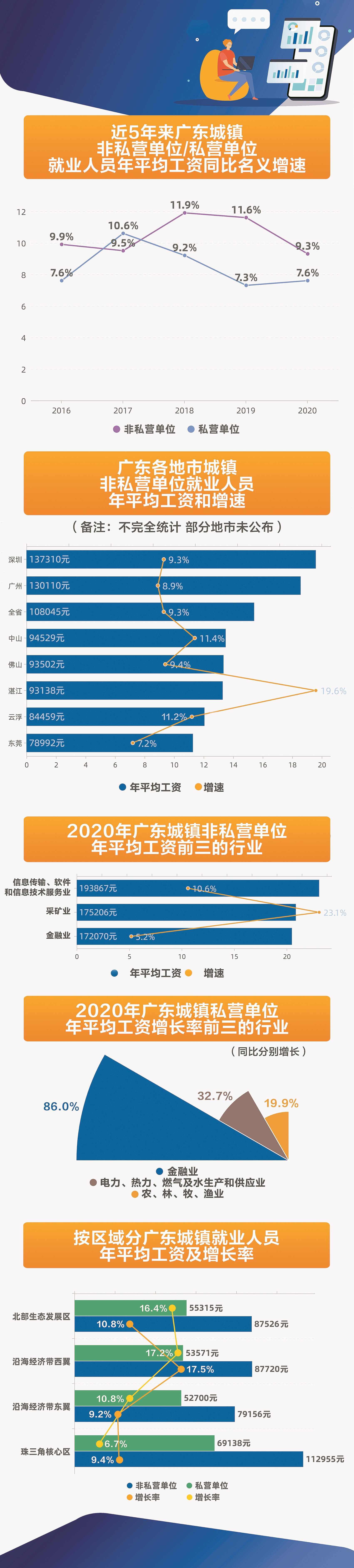 记者注意到,去年,受新冠肺炎疫情、世界经济衰退等因素影响,就业人员年平均工资增速普遍回落。其中,广东城镇非私营单位就业人员年平均工资增速比2019年回落2.3个百分点;私营单位方面,个别城市年平均工资出现了下降,如2020年广州市城镇私营单位就业人员年平均工资为68826元,同比名义下降0.1%。
