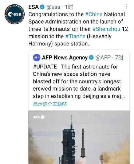 欧洲航天局祝贺中国国家航天局成功发射神舟十二号载人飞船,文中也使用了“taikonaut”: