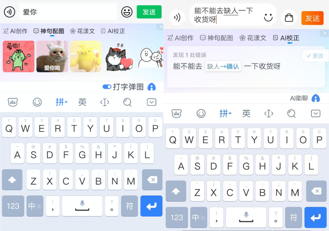 对表情包爱好者来说,神句配图功能更是必不可少,通过AI智能配图,打字就能出表情包,让不善言辞的用户摆脱“尬聊”困扰。此外,基于词法、句法分析和语义理解模型等多维特征构建出的智能文本纠错模型,“AI助聊”的校正功能可智能识别并纠正错别字,避免出现用户打错字的尴尬瞬间。