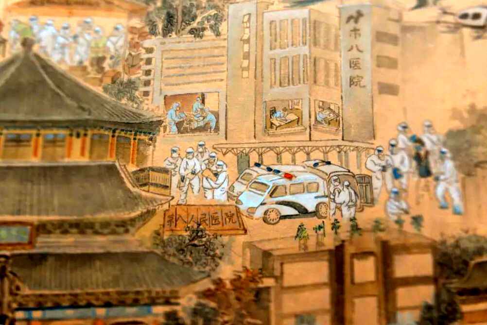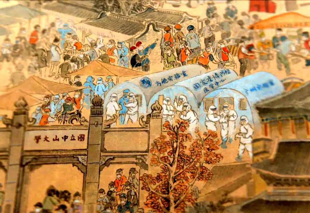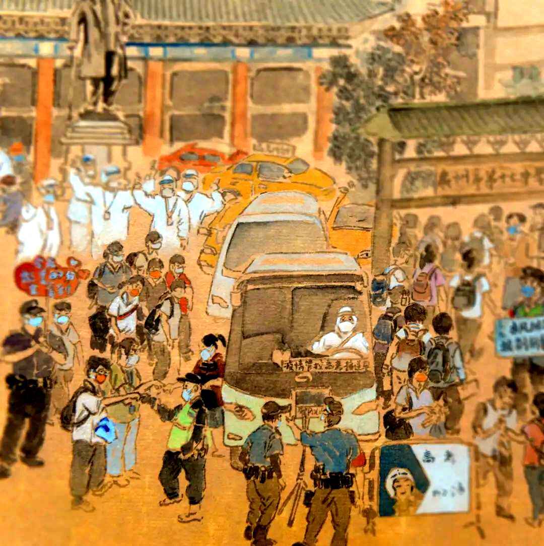 在画卷中,可以看到有测温场面、警方维持秩序、医护人员为高考生加油、无人机、方舱实验室等助力战疫、医院隔离病房内的考场等细节描绘。